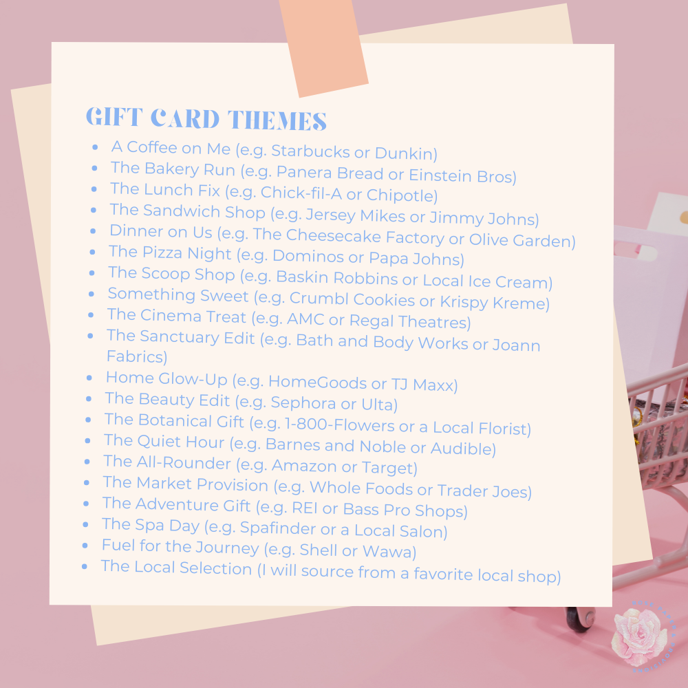 Elevate your Sweet Sentiment or double up on your Rosy Remark with our personal gift card concierge service! Whether you’d like to include a morning latte, a favorite new book, or a full-on shopping spree, we will personally source a physical gift card to tuck inside your hand-painted watercolor card. It’s more than a gift—it’s a complete experience, beautifully packaged and delivered with heart.